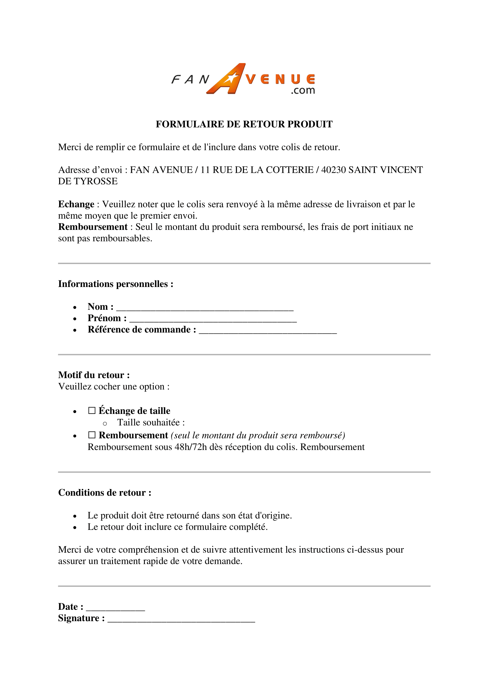 Le produit ne vous plaît pas ? La taille ne convient pas ? Cliquez sur ce formulaire de retour à compléter et à joindre à votre colis pour un remboursement ou un échange.